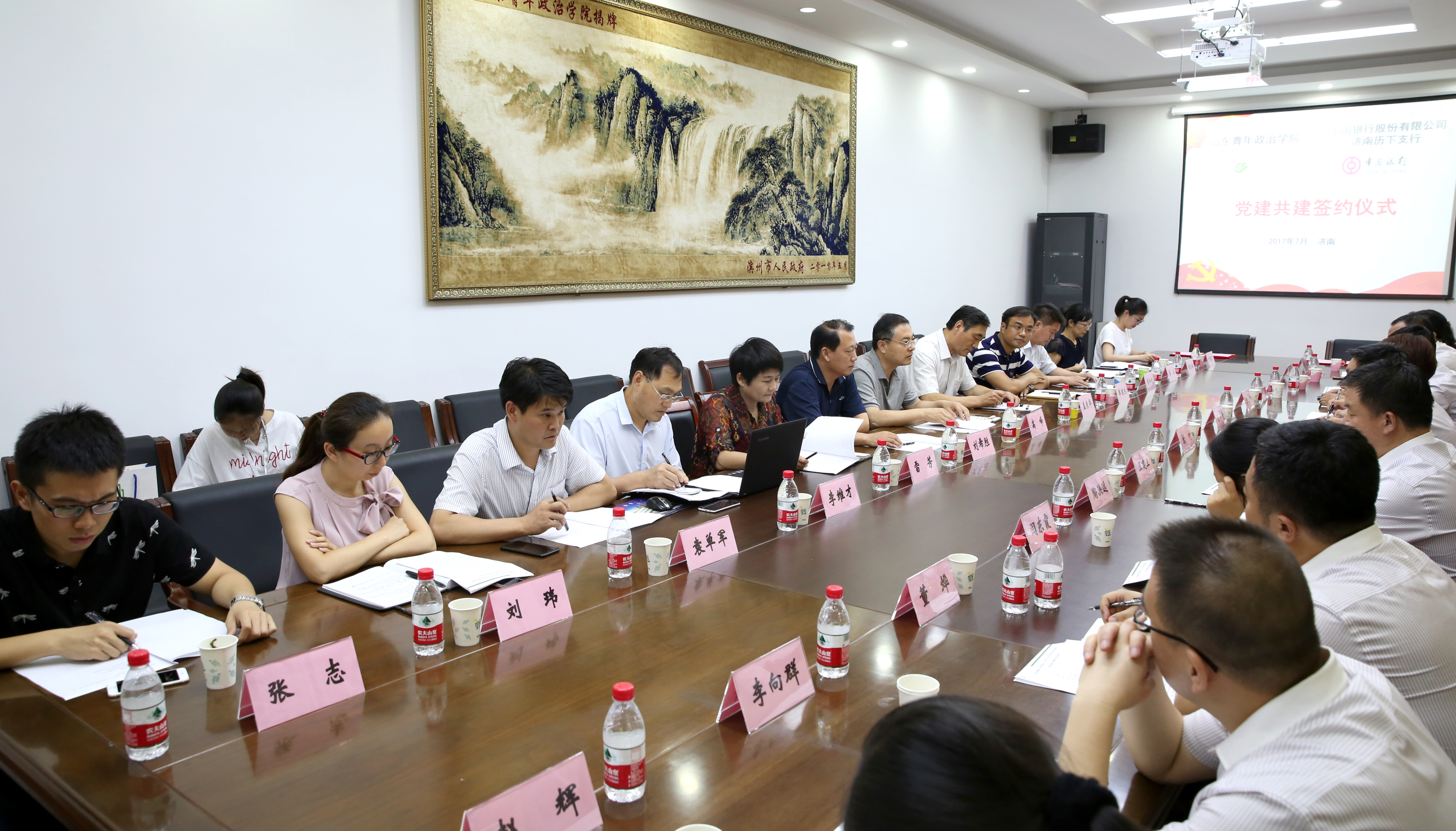 中国银行济南历下支行党总支部张军青书记、山东青年政治学院机关党组织书记刘希胜同志代表双方共同签署了《党组织结对共建协议书》,双方互换协议文本并合影留念。